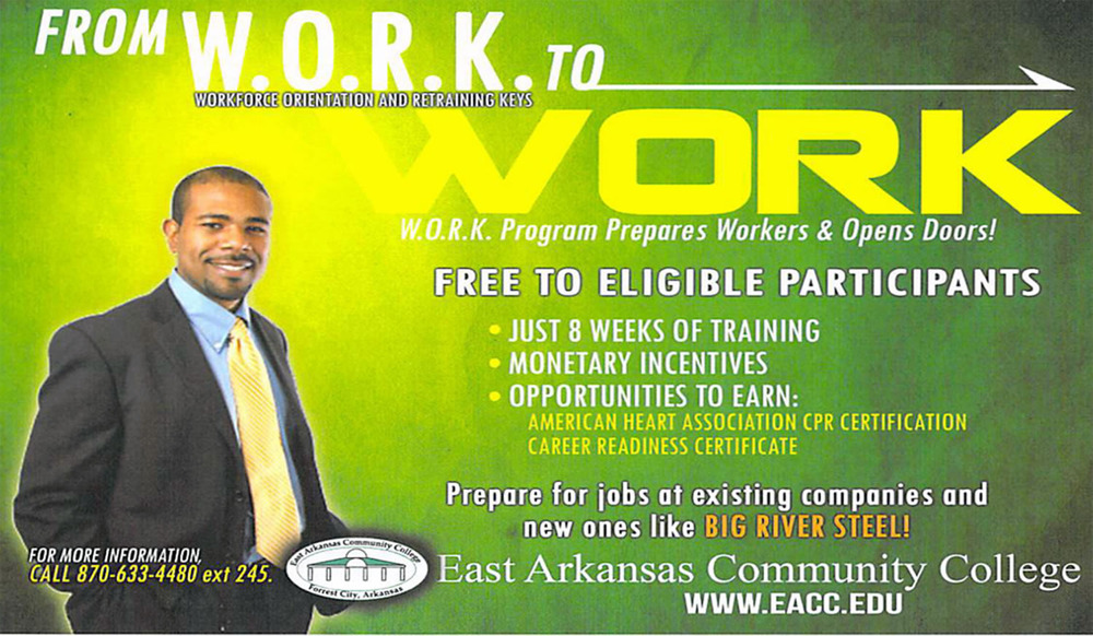 - Complete a W.O.R.K. Application (Call EACC at 870-633-4480 ext. 245 Kevin Bingham) for an application or visit Arkansas Department of Workforce Services and ask for a W.O.R.K. Program Application.